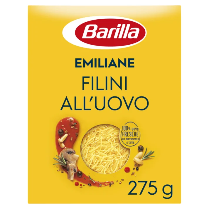 Barilla Emiliane Filini all'uovo n. 014 to bardzo cienkie nitki makaronu jajecznego z semoliny z pszenicy durum i świeżych jaj. Jego cienki i elegancki kształt oraz jajeczny smak wzbogaci zupy naturalnością i prostotą.
