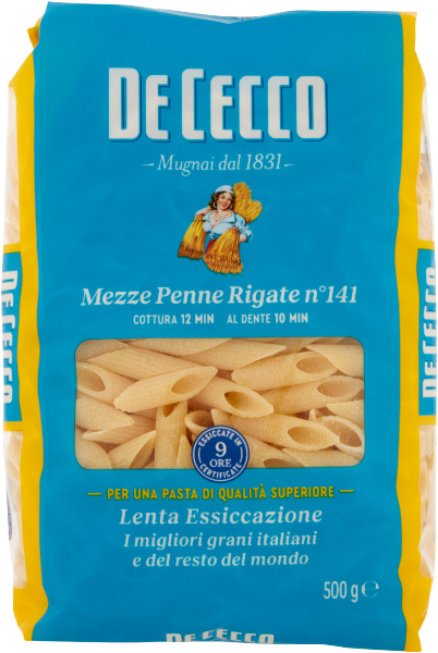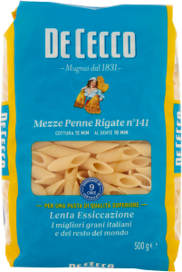 De Cecco Mezze Penne Rigate n'141 to krótki makaron penne. Mezze Penne Rigate, dzięki niewielkim rozmiarom, doskonale nadają się do mieszania z przyprawami, zwłaszcza tymi bardziej kremowymi, zarówno czerwonymi z pomidorami, jak i na bazie białego sera, lub z klasycznymi zupami do przyprawiania łyżką.