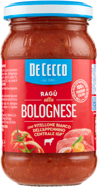 De Cecco „Ragù alla Bolognese” powstał we współpracy z szefem kuchni Heinzem Beckiem, który otrzymał trzy gwiazdki Michelin i został wykonany z zachowaniem oryginalnej prostoty receptury: oliwa z oliwek z pierwszego tłoczenia jest dodana z bogatą mieszanką cebuli, selera, marchwi i wybranego mielone mięso wołowe Vitellone Bianco dell'Appennino Centrale IGP, łopatka wieprzowa i pancetta, następnie pulpa i przecier pomidorowy, ściśle włoski. Nazwa „Biała Wołowina ze Środkowych Apeninów ChOG” ma znaczenie bogate w treści: