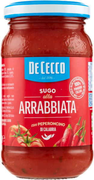 De Cecco Sugo all’Arrabbiata to włoski sos pomidorowy do makaronów wzmocniony papryczką chilli oraz cebulą smażoną na oliwie z oliwek.