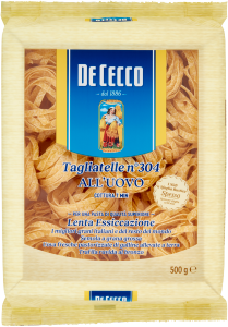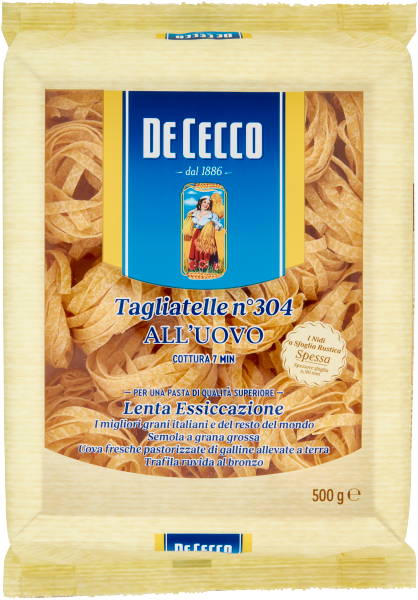De Cecco Tagliatelle n° 304 all'uovo jest szeroko rozpowszechniony we Włoszech i należy do rodziny makaronów o długich płaskich przekrojach. Pochodzą z regionów północnych Włoch. Ich naturalna wszechstronność sprawia, że są smaczne ze wszystkimi rodzajami przypraw i sosów. Doskonale komponują się z sosami na bazie ryb, skorupiaków, masłem lub białymi sosami z miękkich serów i śmietany z dodatkiem curry lub szafranu.