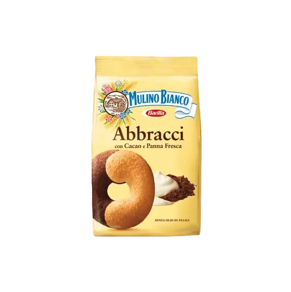 Mulino Bianco Abbracci con Cacao e Panna Fresca to dwusmakowe herbatniki o niezwykle kruchej strukturze. Część ma smak kakao, zaś druga połowa - naturalny. Ciasteczka te są smażone na maśle, zgodnie z tradycyjną recepturą, dlatego mają wyjątkowy smak, którego nie da się podrobić.