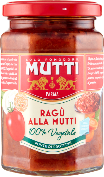 Mutti Ragù zawiera w sobie doznania smakowe i konsystencję sosu mięsnego, ale ze 100% roślinnymi składnikami: smażoną marchewką i cebulą, bogactwem białek żółtego groszku i całym smakiem przecieru pomidorowego Mutti. Nowy sposób rozumienia sosu mięsnego: w 100% roślinny, smaczny, treściwy i będący źródłem białka.