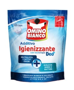 OMINO BIANCO SANITIZING ADDITIVE z technologią Deo+ w formacie Idrocaps, dzięki innowacyjnej formule neutralizuje nieprzyjemne zapachy oraz usuwa zarazki i bakterie.