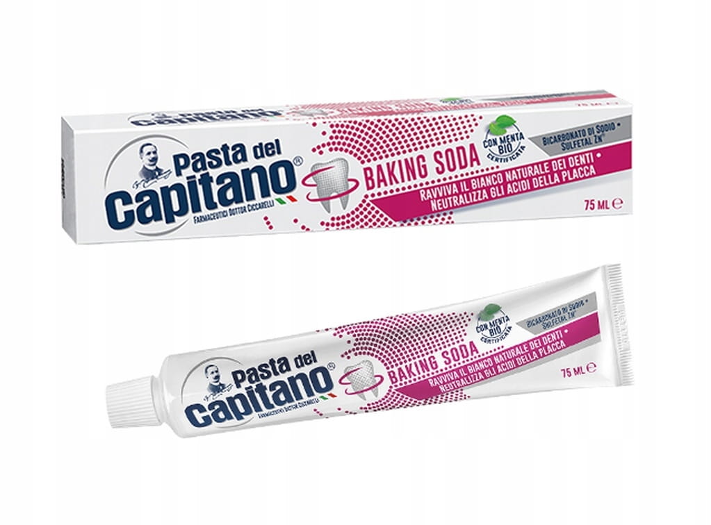 Pasta del Capitano Soda oczyszczona do zębów, z wodorowęglanem sodu, który wybiela zęby bez uszkadzania szkliwa.