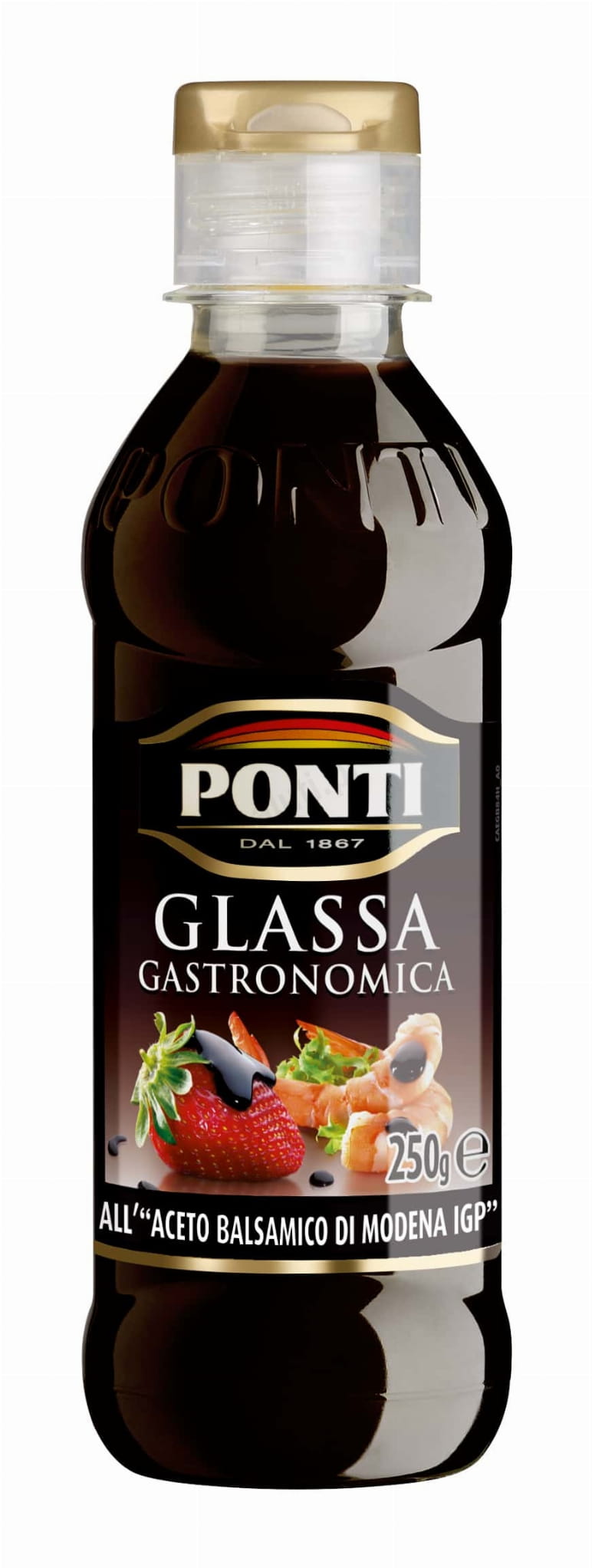 Glazura gastronomiczna Ponti z octem balsamicznym z Modeny pochodzi z połączenia octu balsamicznego z Modeny z gotowanym moszczem winnym. Jej słodko-kwaśna nuta poprawia smak najróżniejszych przystawek, drugich dań z mięsa lub ryb, serów i deserów. Dodaj odrobinę kreatywności do swojej kuchni. Glassa Ponti ozdobi Twoje dania i wzbogaci ich smak.