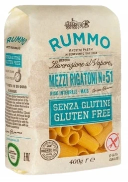Mezzi Rigatoni nr 51 od RUMMO to bezglutenowy makaron stworzony z myślą o osobach z nietolerancją glutenu oraz tych, którzy szukają lekkiej alternatywy bez utraty tradycyjnego smaku włoskiej pasty. Dzięki starannie dobranej mieszance mąki ryżowej i kukurydzianej zachowuje doskonałą sprężystość i aksamitną konsystencję po ugotowaniu.